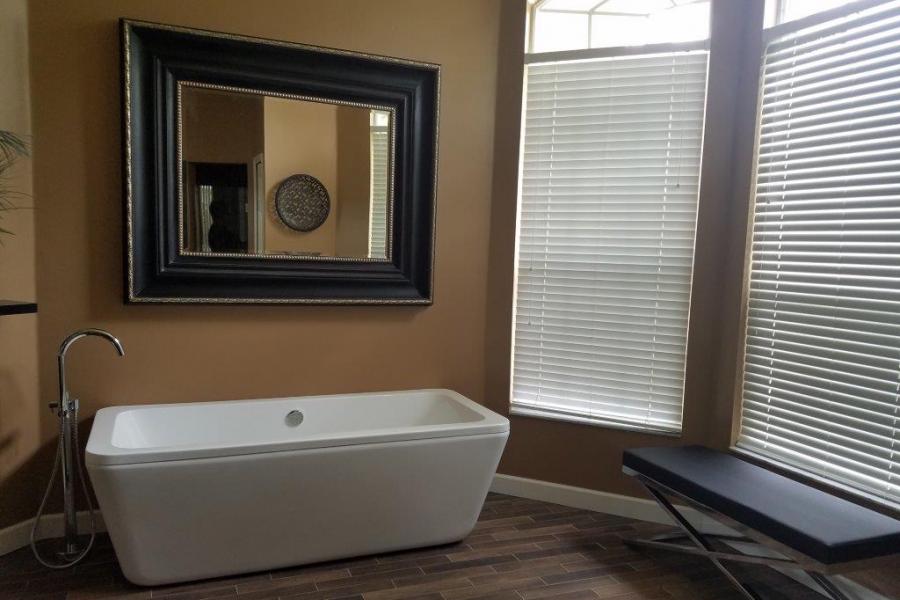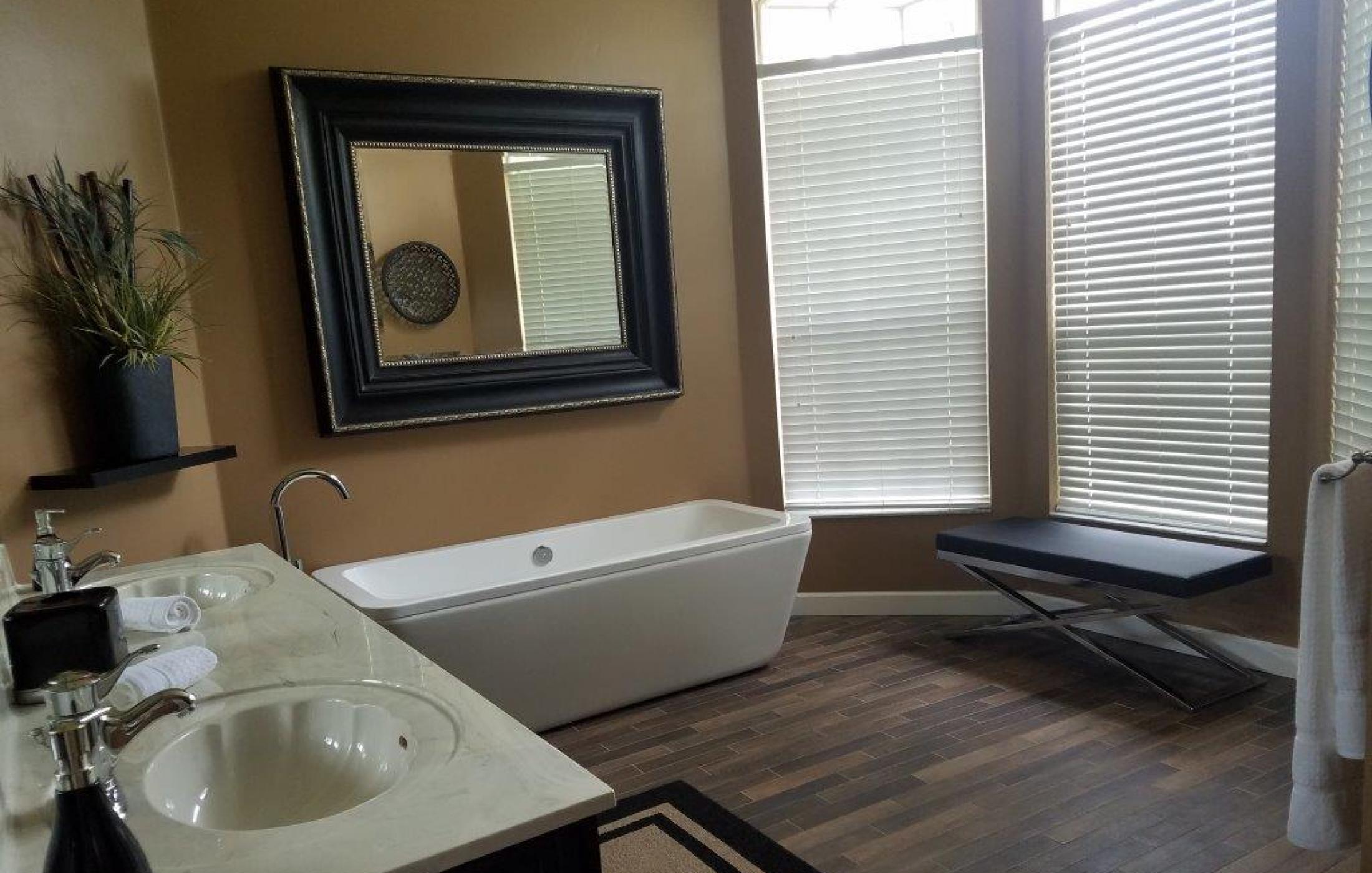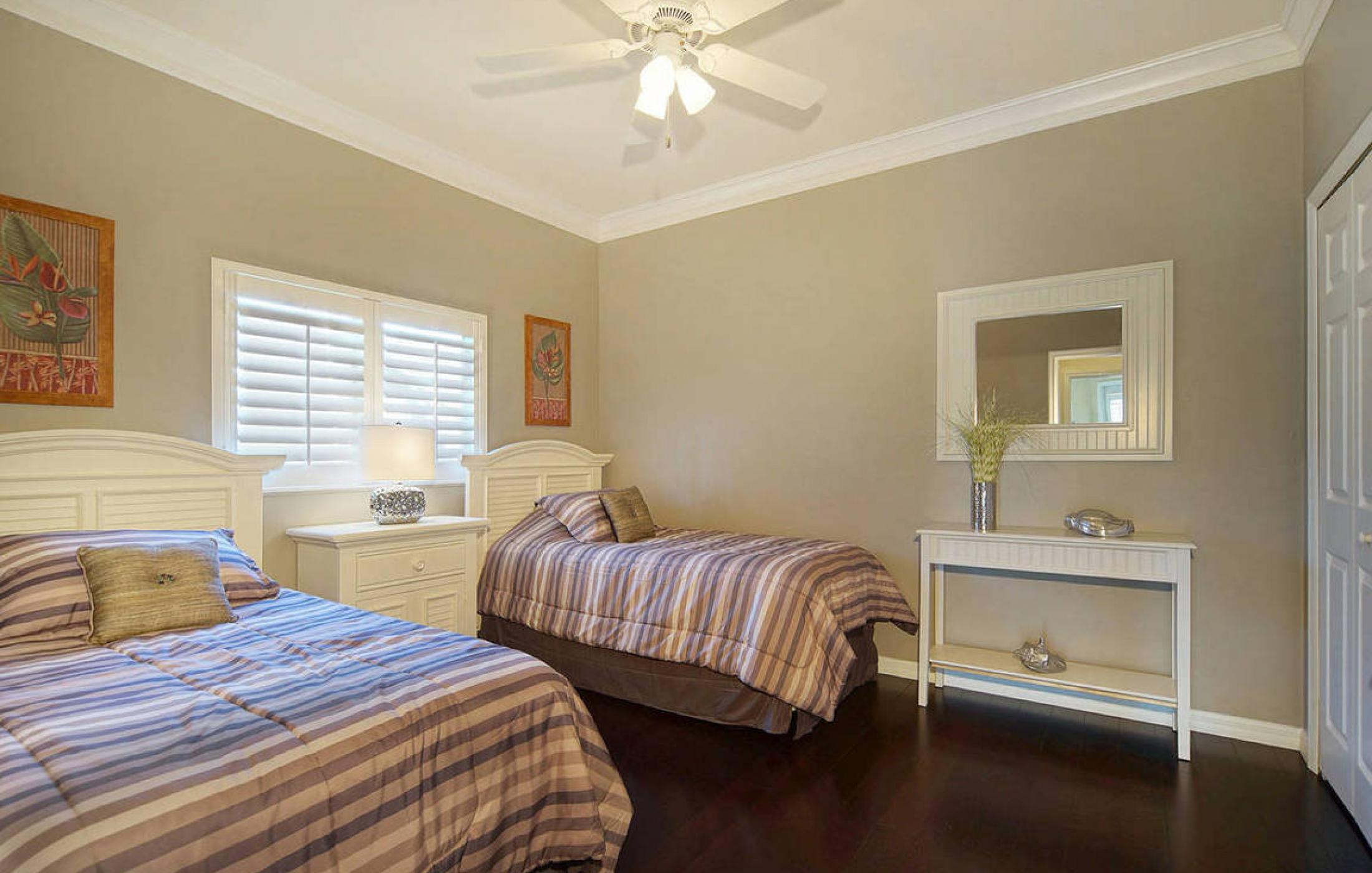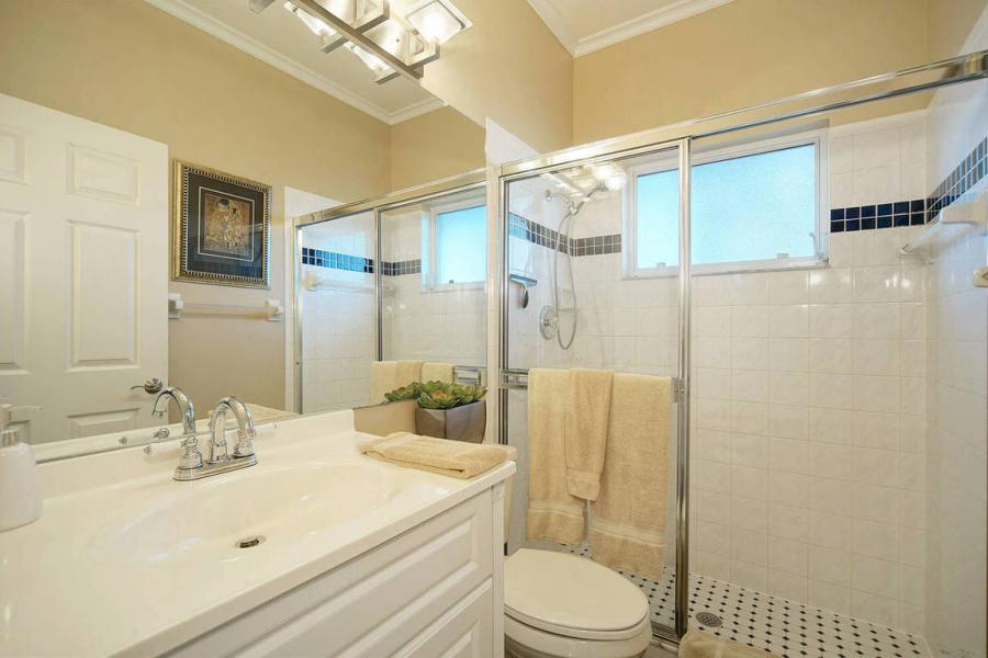 The master bedroom has its own large bathroom with a walk-in shower and a freestanding bathtub. The second bathroom has a walk-in shower and is shared by the two guest bedrooms. An additional small pool bath is also available.