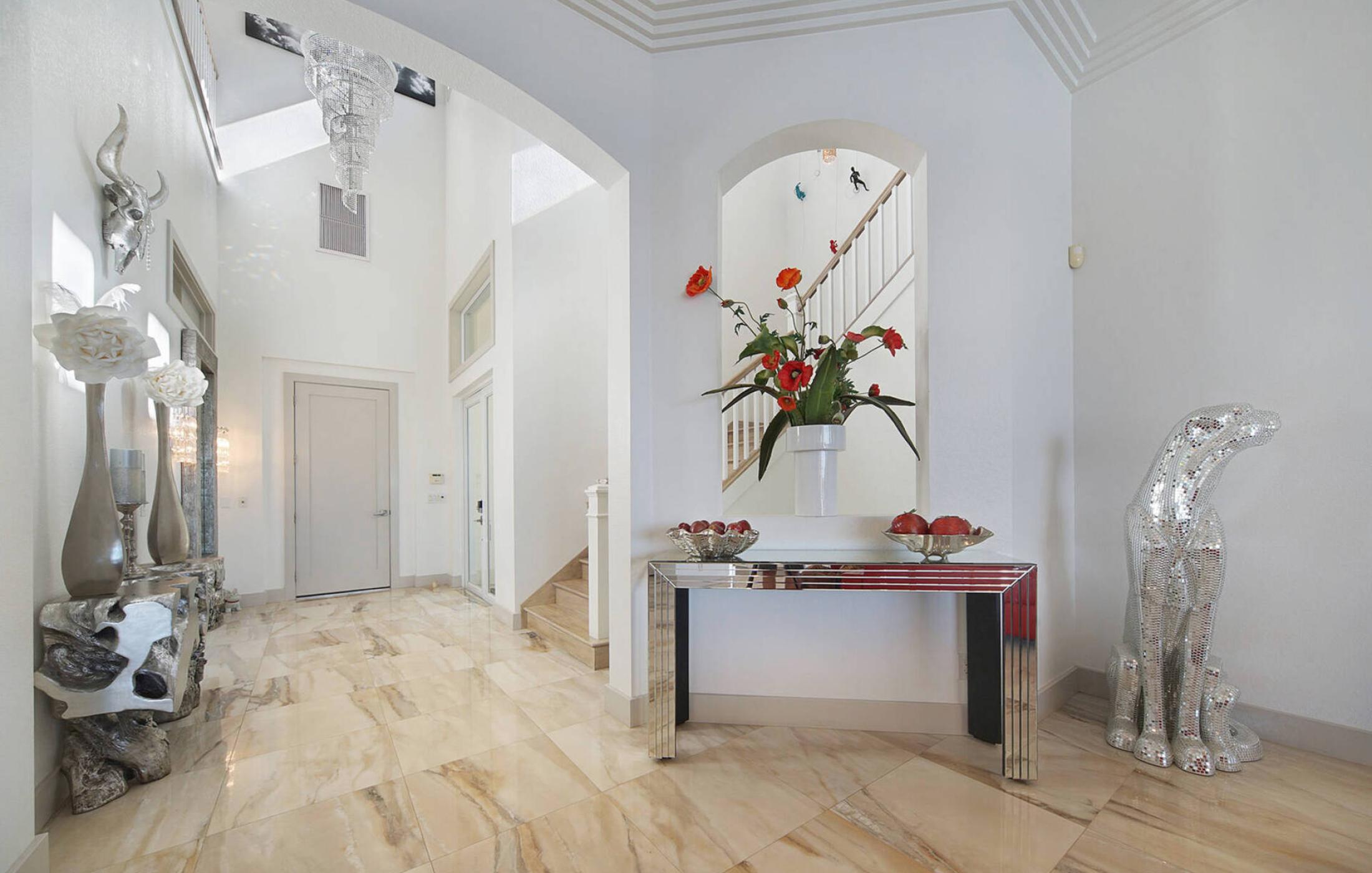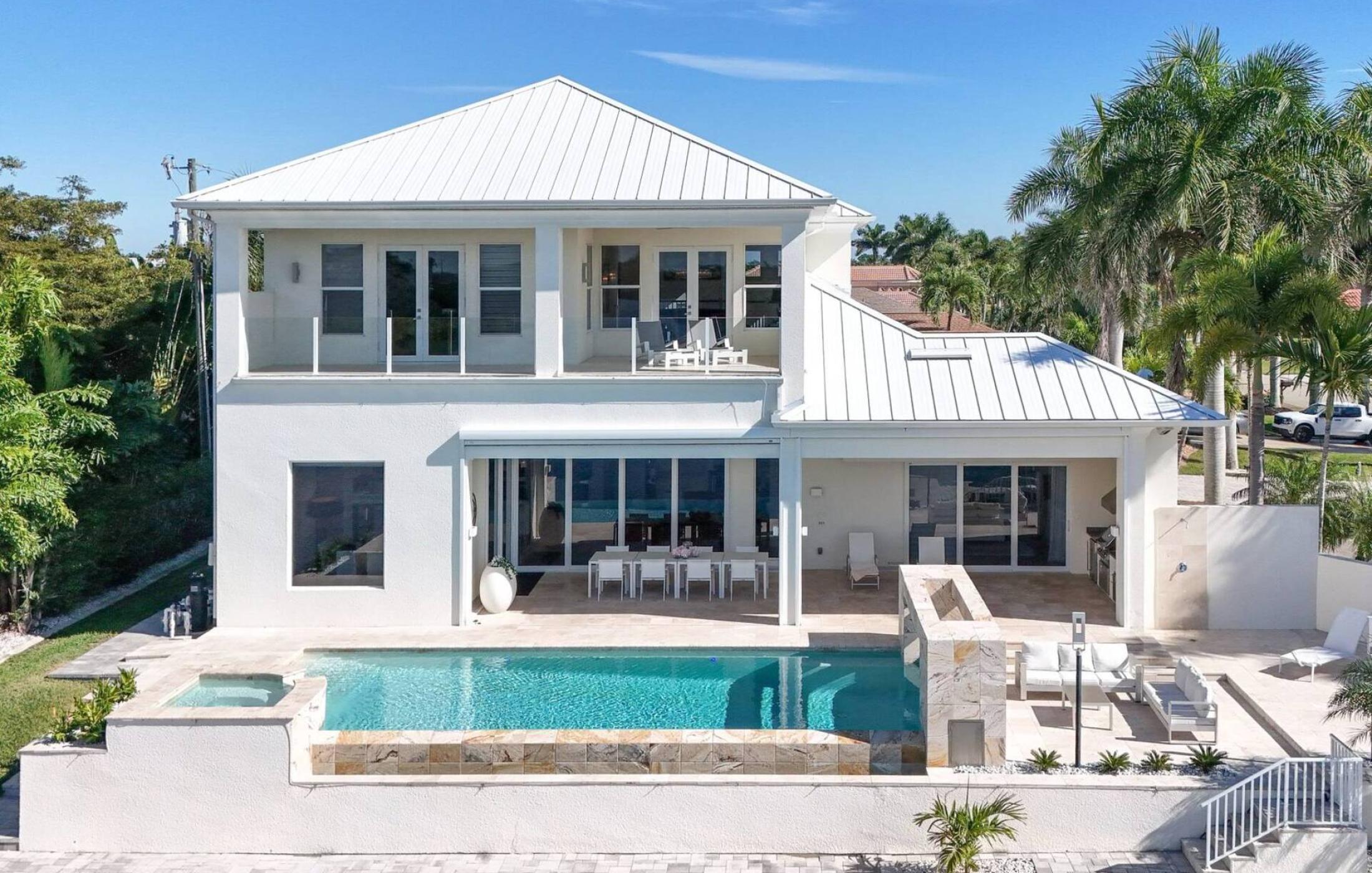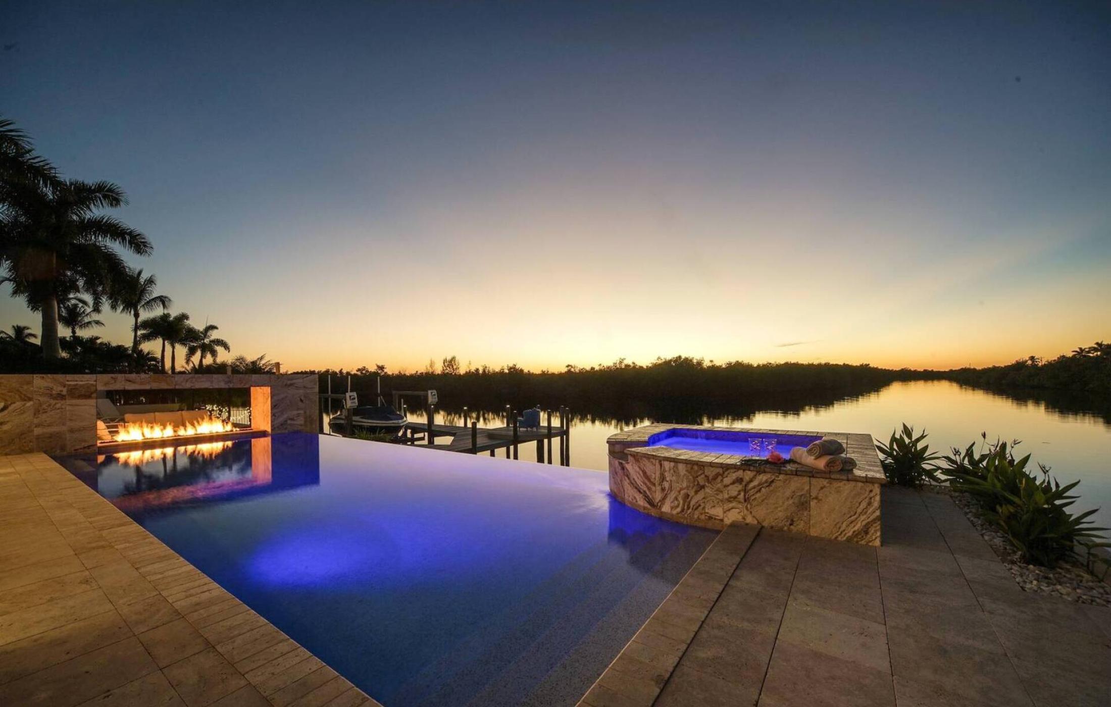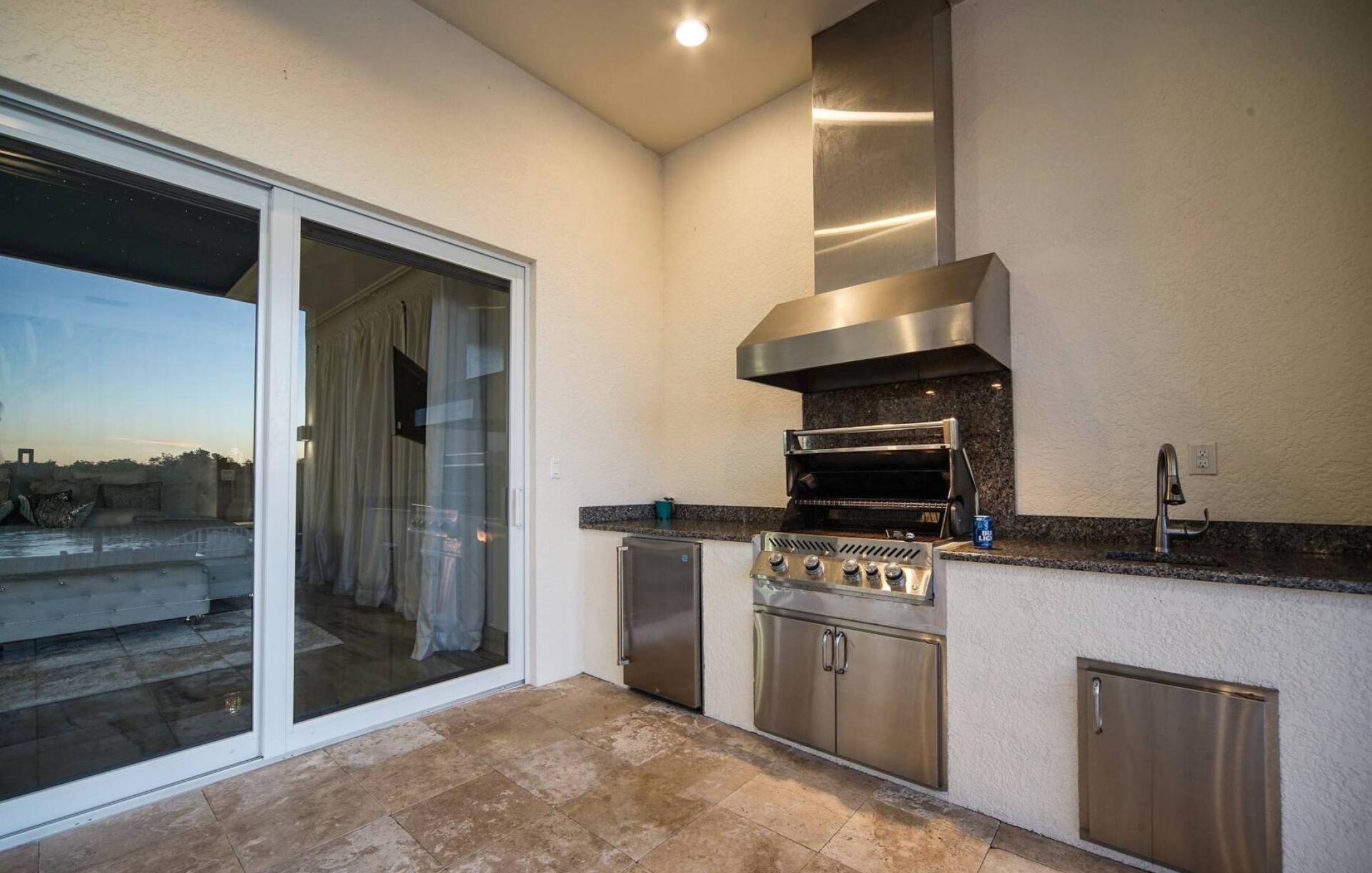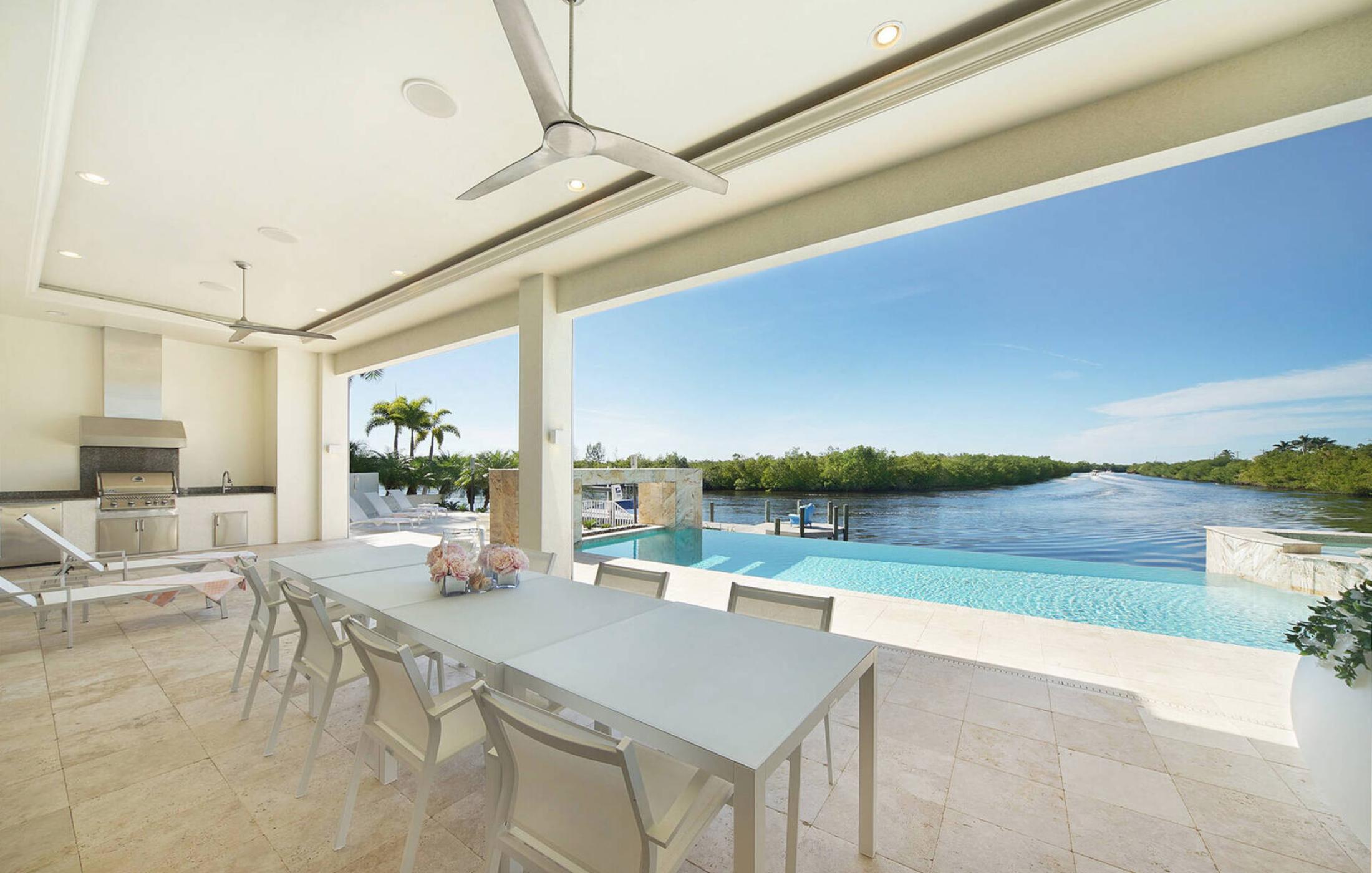 The outdoor area impresses with its size and views. Due to the west orientation of the pool area you can enjoy the Florida sun most of the day and relax on the lounge furniture. The electrically heated pool and spa with salt system (no salt film on the skin and very soft water) leaves nothing to be desired. The covered area spoils with a summer kitchen, here you can prepare the fresh catch directly. A dining table for 8 people, to enjoy your meals outdoors or enjoy a game night, is also available.