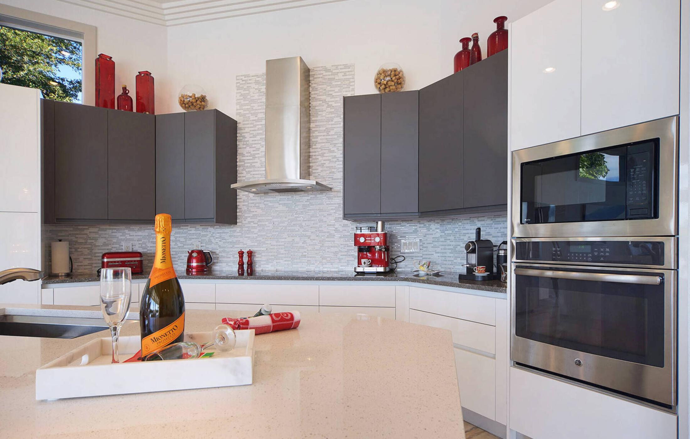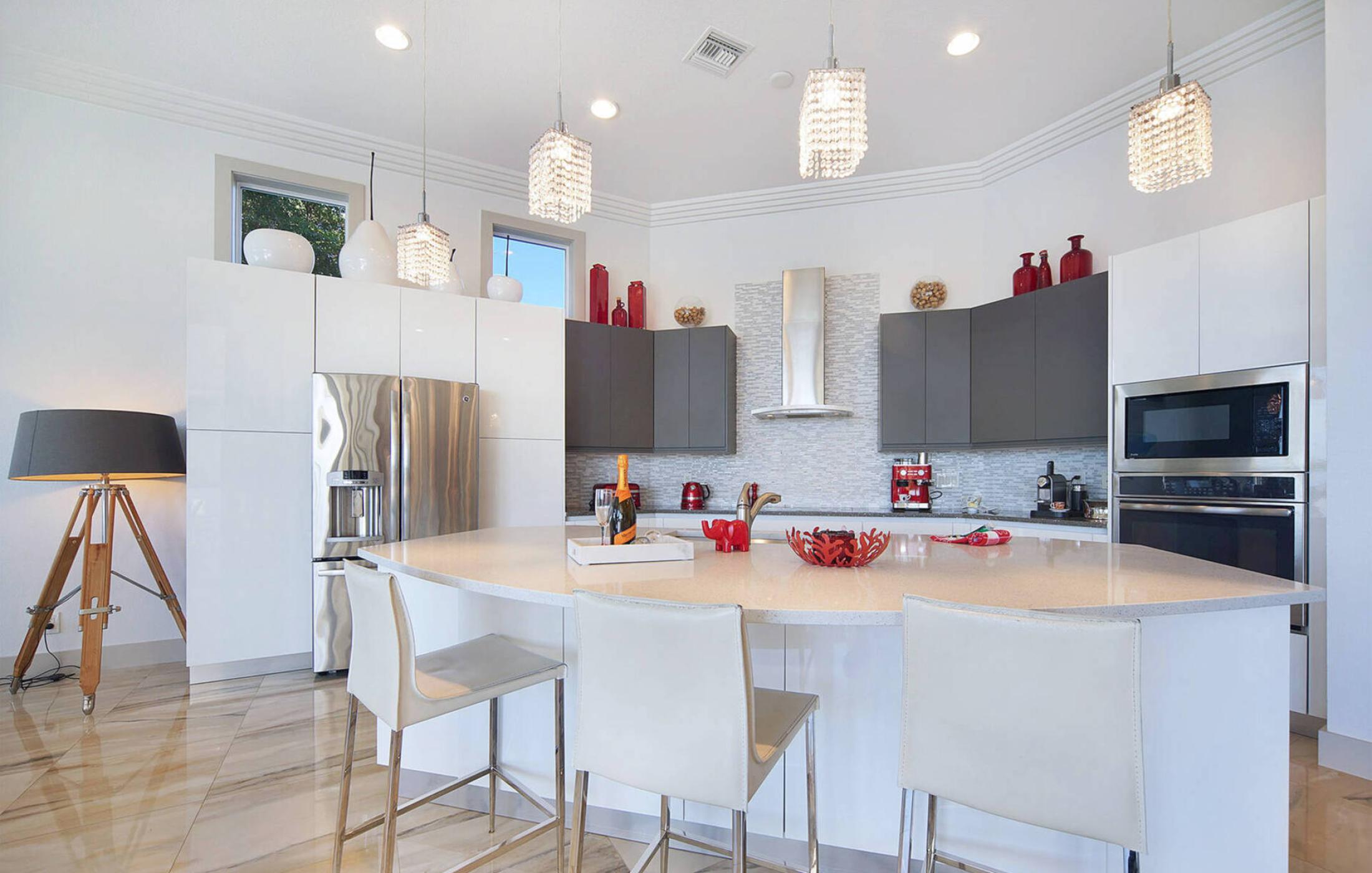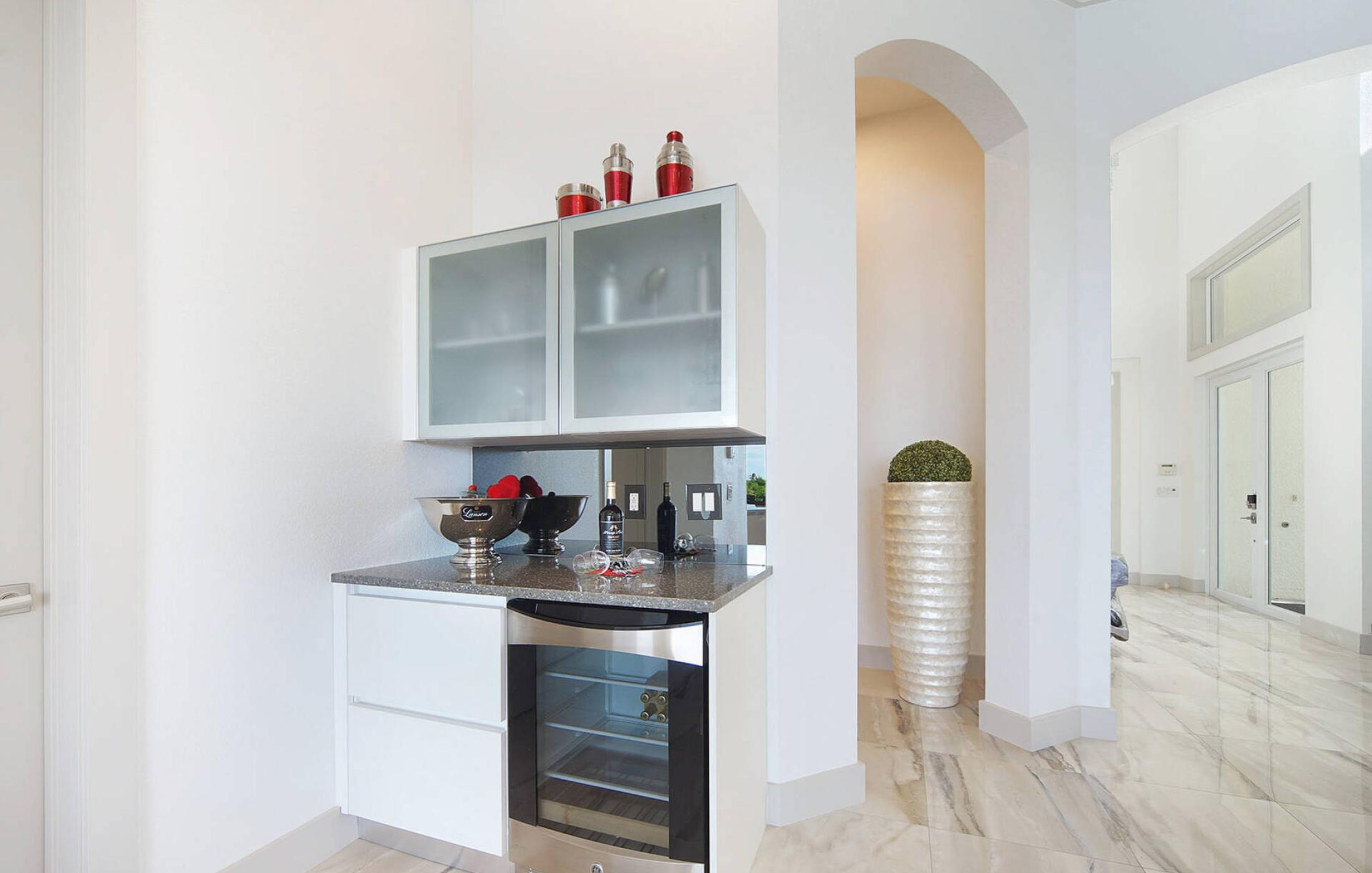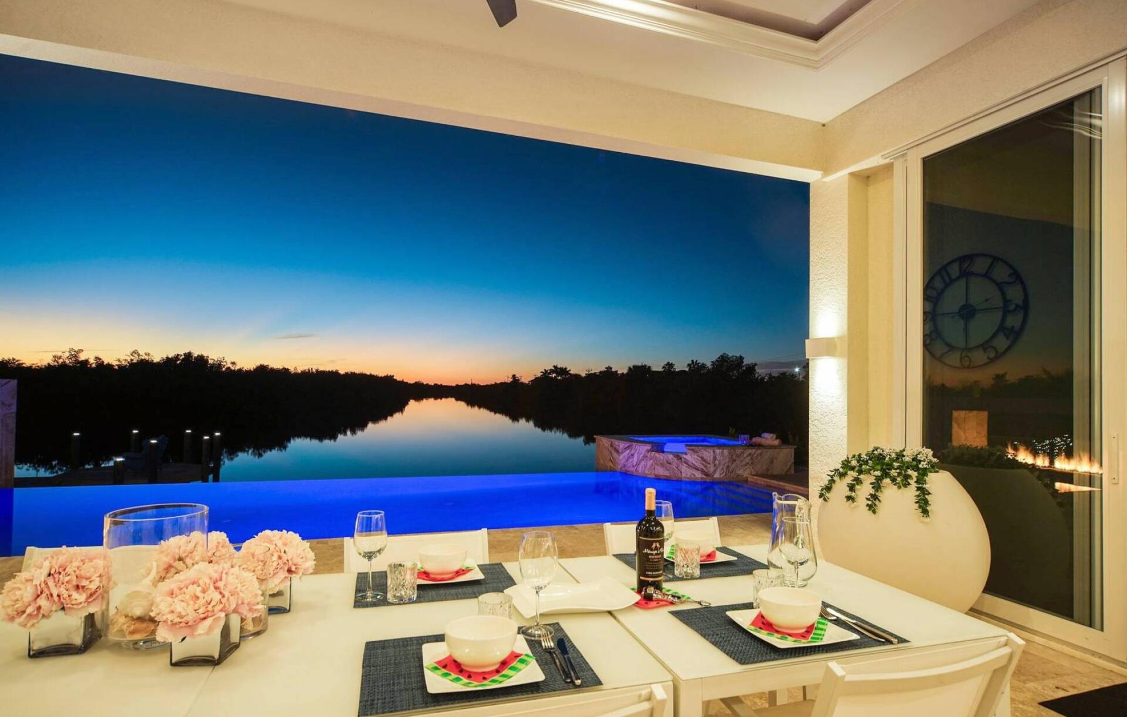 The open and modern kitchen was specifically designed for this villa and is fully equipped to delight every cook. In addition, the open kitchen has a kitchen island for extra space to prepare or entertain. Further in this spacious floor plan is the dining area with a big designer dining table for 8 people. Here you can enjoy your meals with an amazing view of the wide spreader canal and native mangroves. A bar is available do mix some summer-drinks and indulge in the laid-back Florida lifestyle.
