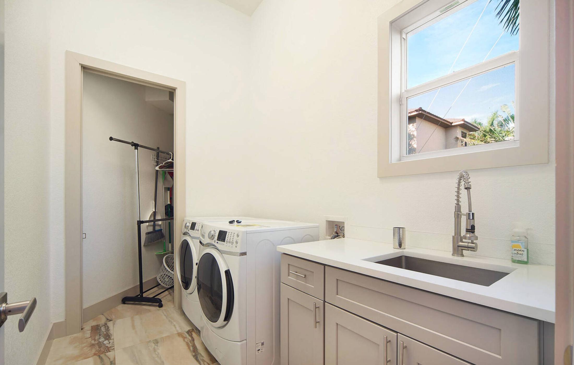 The functional laundry room was equipped with a high-quality washing machine and a corresponding dryer and has ironing equipment and cleaning utensils.