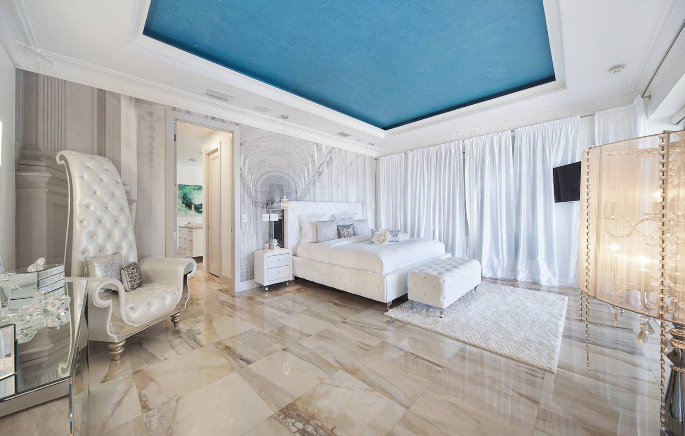 • Master suite 1 with king-size bed (1st floor). This large and elegant castle-like suite has direct access to the pool and is an ideal retreat to relax. The wall and ceiling art makes this room a special experience for our special guests.