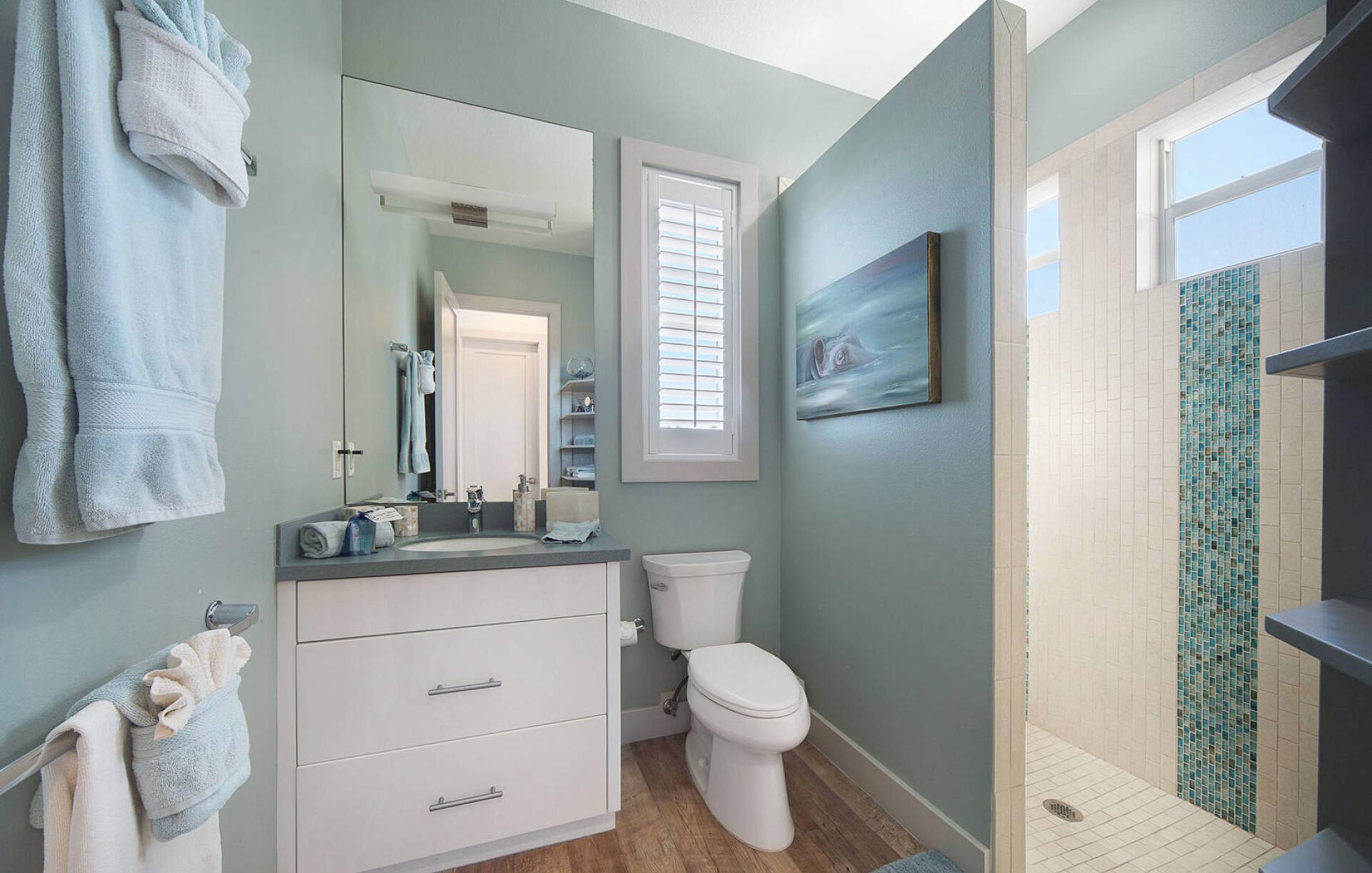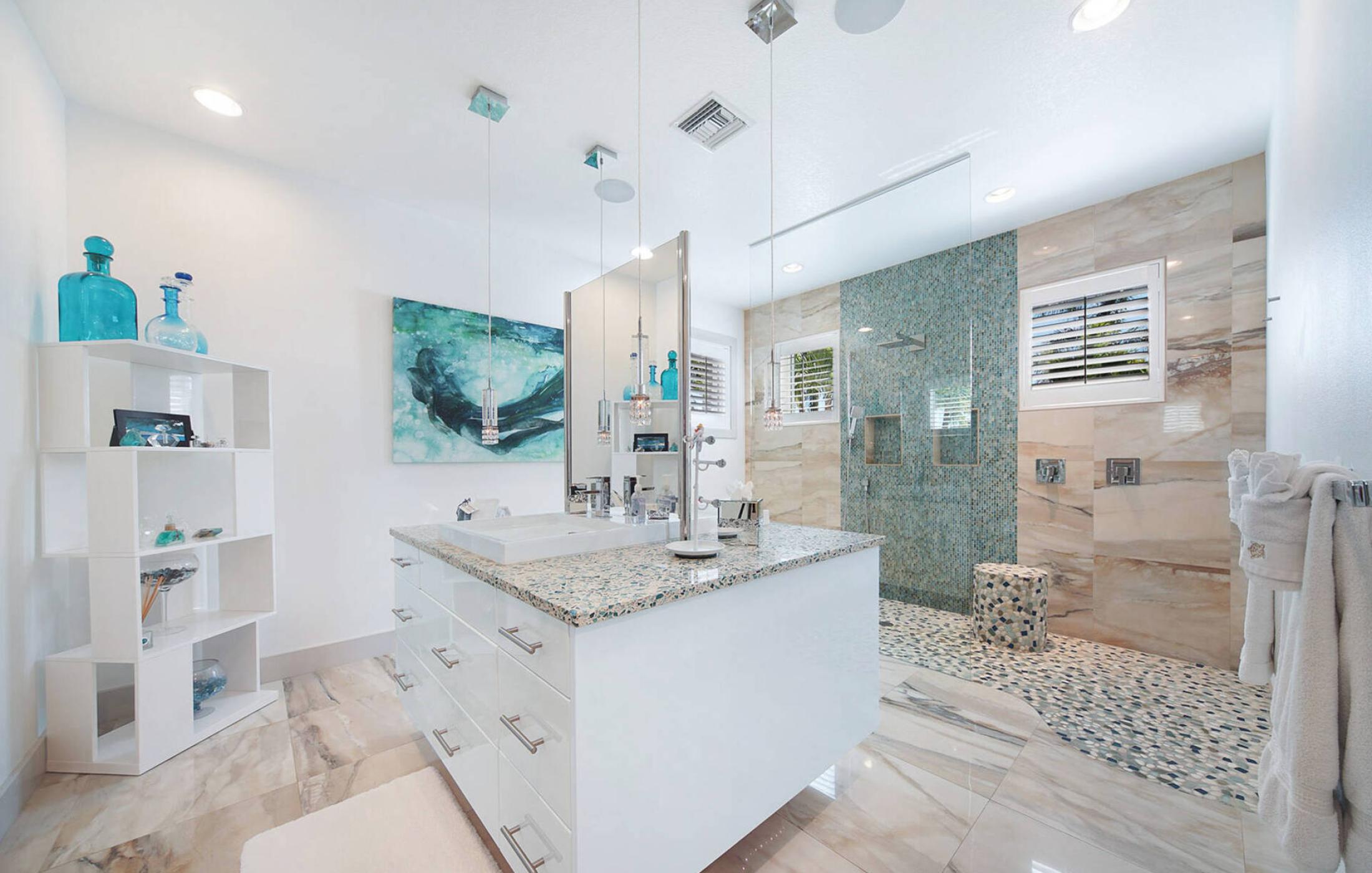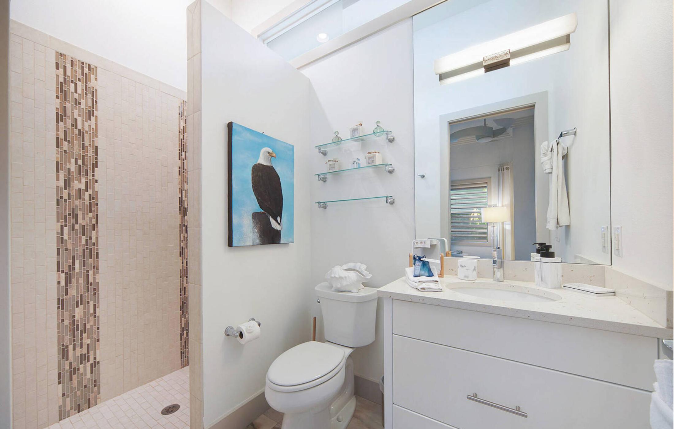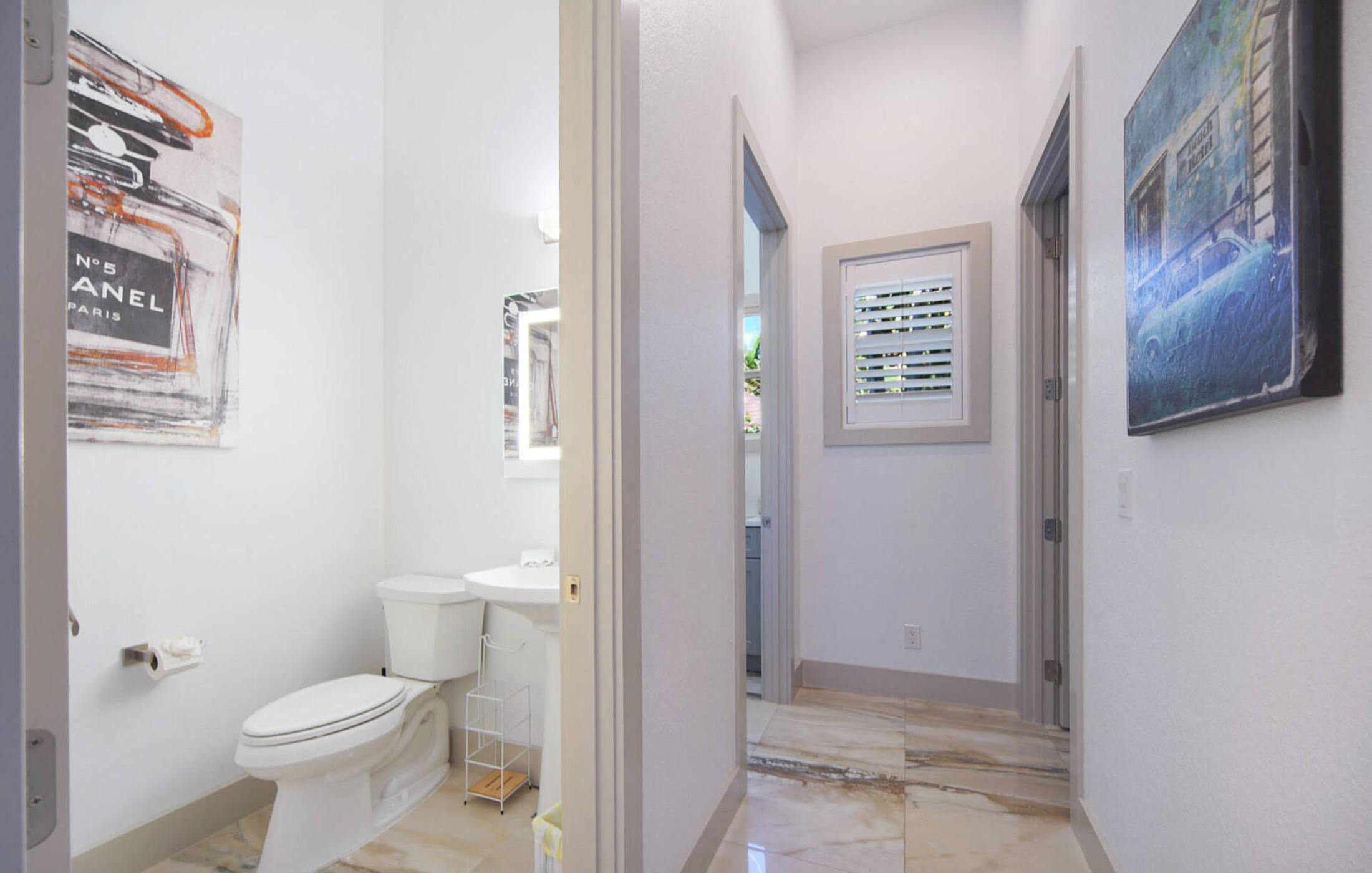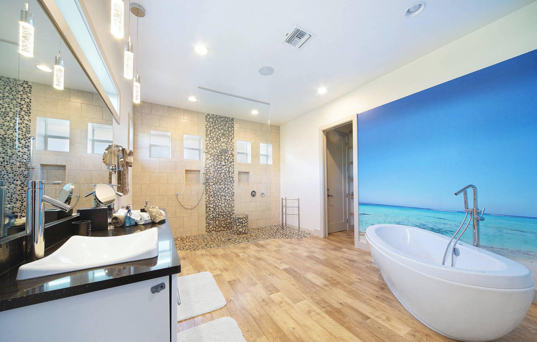 The two master bedrooms have their own large bathrooms with walk-in rain showers. The master bathroom on the second floor has an additional free-standing bathtub. The two guest bathrooms with walk-in showers are directly ensuite and are accessible from the guest bedrooms. Additionally, there is a small powder bath for guests. All bathrooms are equipped with high quality materials.