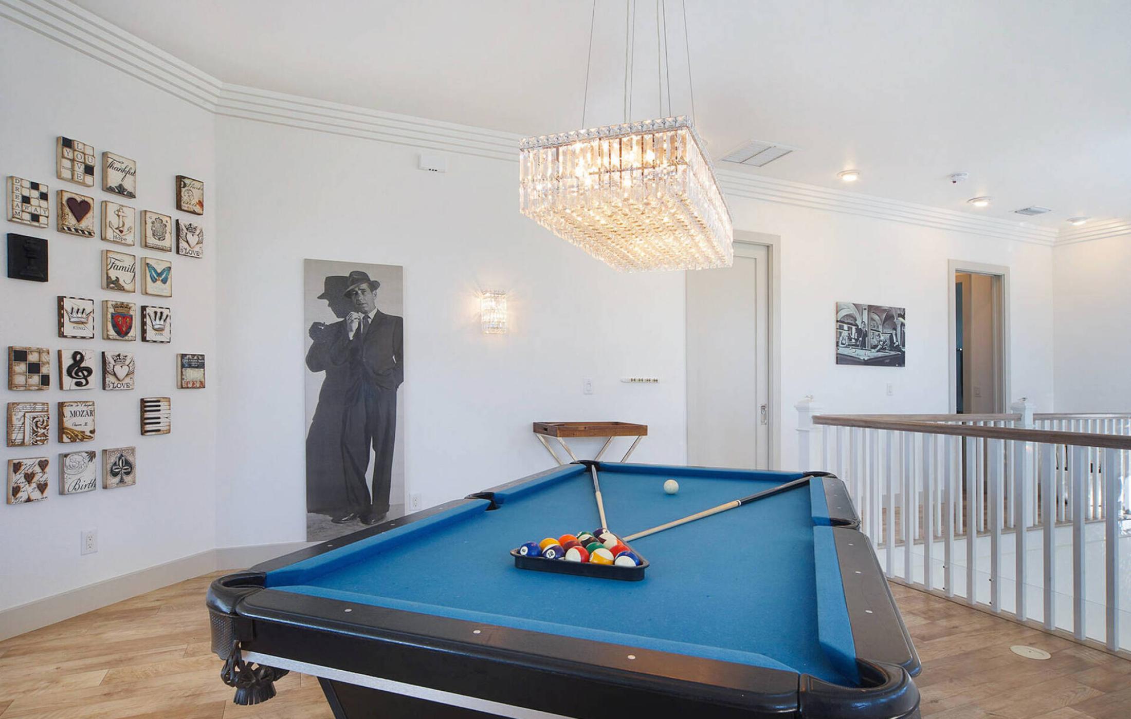 A staircase leads to the upper floor. The upper living area is used as an entertainment room and is equipped with a pool table, a seating area with TV, and games. Access to the balcony is also possible from here.